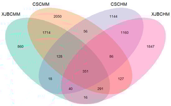 Venn diagrams of the OTUs of different groups of XJBC milk microorganisms (XJBCMMs), XJBC hindgut microorganisms (XJBCHMs), CSC milk microorganisms (CSCMMs) and CSC hindgut microorganisms (CSCHMs).