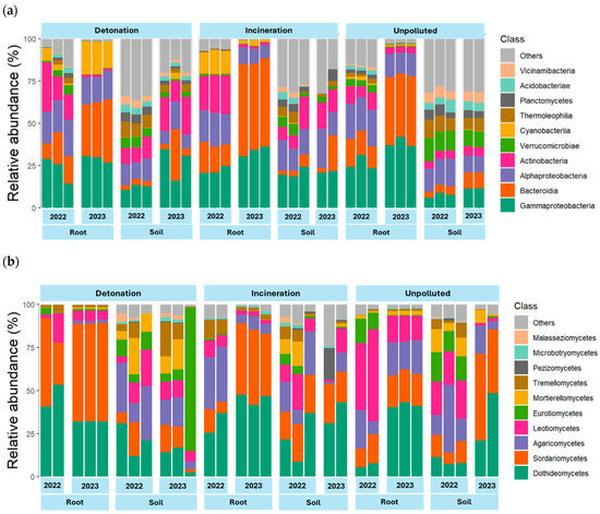 Bacterial communities were analyzed using 16S amplicons, while ITS was used for assessing fungal and plant communities. The taxonomic composition of bacteria, fungi, and plants varied depending on year, type of sample, and site. Bacterial composition at the class level showed that Gammaproteobacteria and Bacteroidia were dominant in most soil and root samples, except in unpolluted soils, where Alphaproteobacteria was the most abundant and class distribution was more even (Figure 1a). At the genus level, differences between soil and root microbiota were evident. Most notably, Flavobacterium, Pseudomonas, and Rhizobium were more abundant in root samples than in soil samples, while Candidatus Udaeobacter was common in soil samples, especially in unpolluted soil. Streptomyces and Pseudoarthrobacter were more abundant in polluted roots (Figure 2a).