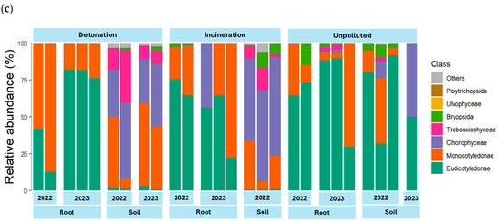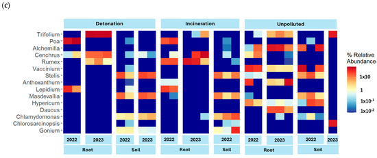 A subset of ITS sequences, assigned to Viridiplantae and representing 4% of the total reads, was used for the plant relative abundance analysis. Streptophyta groups, Monocotyledoneae and Eudicotyledoneae were the most abundant, but DNA from Chlorophyta classes Chlorophyceae and Trebouxiophyceae was also highly abundant in soil samples, especially in contaminated soils (Figure 1c). DNA from Alchemilla, Vaccinium, and Hypericum was more abundant in unpolluted samples. The plant genera Rumex and Lepidium appeared mostly at detonation and incineration sites. Poa was the most abundant genus in root samples from 2022 and Trifolium in root samples from 2023. DNA from the orchid genus Stelis and the green algae Chlamydomonas was found mostly in soil samples, regardless of contamination (Figure 2c).