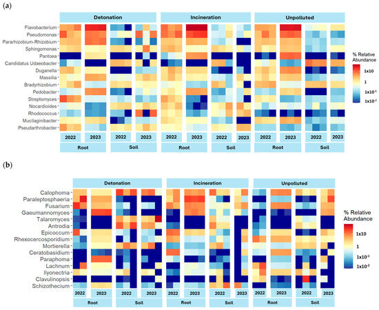 Beta diversity analysis revealed that both bacterial and fungal communities were significantly influenced by site, sample type (root vs. soil), and sampling year. For bacterial communities, site and sample type were the most influential factors, which is consistent with previous studies that have highlighted the strong effect of contamination on microbial community structure [12]. Notably, the difference in root beta diversity between contaminated and unpolluted sites suggests a dynamic response of root-associated microbial communities to environmental changes, potentially driven by plant–microbe interactions.