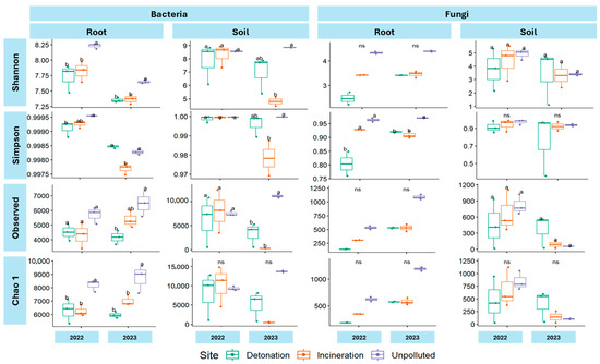 Observed, Shannon, Simpson, and Chao1 alpha diversity indices were calculated for both bacterial and fungal root and soil samples (Supplementary Table S1). The Shapiro–Wilk normality test indicated that most alpha diversity index data were normally distributed. No significant differences among sites were observed with indices with non-normally distributed data. In bacterial root samples, all indices showed significant differences between polluted and unpolluted sites, with unpolluted sites having the highest values of most indices, except the Simpson index for the 2023 samples, where the detonation site had the highest value. In bacterial soil samples, significant differences were found only for 2023 samples, with unpolluted sites showing the highest values across all indices. For fungi, significant differences were only observed in the Simpson index for root fungi, with higher values at unpolluted sites (Figure 3).