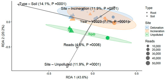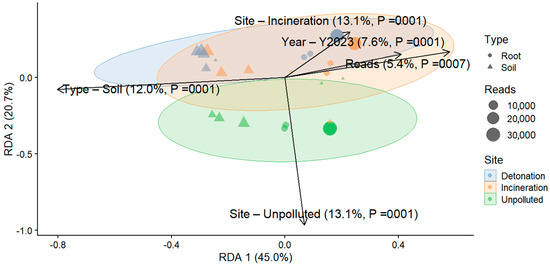 The microeco library was used to build abundance heatmaps and bar plots and to calculate observed species, Shannon, Simpson, Chao1, and alpha diversity indices [20]. A Shapiro–Wilk normality test was performed separately on soil and root data for both bacteria and fungi, as it is particularly effective for small to moderate sample sizes. Based on the test results, ANOVA and Duncan tests were performed on normally distributed data to determine if alpha diversity was significantly different among treatments, and the Kruskal–Wallis test was used for non-normally distributed data. This approach ensures the appropriate application of statistical tests and minimizes the risk of Type I or Type II errors. To assess beta diversity, a Redundancy Analysis (RDA) was conducted using the mia package v 1.14 [21]. Before RDA, the ASVs table was transformed to relative abundances to account for varying library sizes across samples. The explanatory variables included in the RDA model were site (detonation, incineration, unpolluted), year (2022 or 2023), and type (root or soil), while the number of reads was also included as a continuous covariate. Bray–Curtis dissimilarity was used as the distance metric, and missing values were excluded from the analysis. The significance of the RDA results was further evaluated through PERMANOVA (Permutational Multivariate Analysis of Variance) to test the influence of each explanatory variable on the microbial community composition [22].
