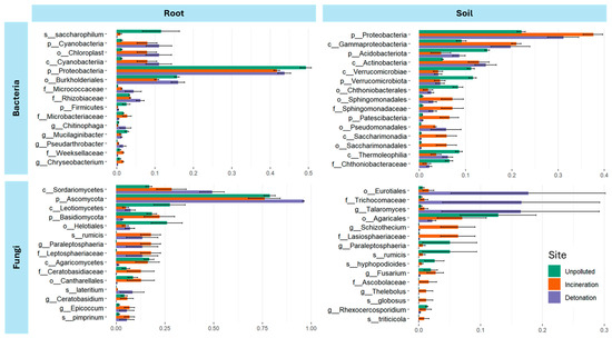 Figure 6. The differential abundance of bacterial and fungal taxa across root and soil samples from unpolluted, incineration, and detonation sites. Error bars represent standard deviations.