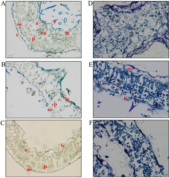 Leaf sections stained with toluidine blue at different sampling points. (A) Leaf at T0, without signs of the degradation process. (B) Samples after one week. (C) Samples after 3 weeks, where the structure is still maintained. (D) Samples after 5 weeks, where chloroplasts showed degradation. (E) Samples after 8 weeks, where neither cell walls nor membranes were appreciable. (F) Samples after 12 weeks, with leaf structure completely damaged. c = cuticle, ue = upper epidermis, p = palisade-like parenchyma with chloroplasts, vc = vascular tissue and cribrous tissue, s = spongy parenchyma, le = lower epidermis, and t = trichomes. In white Scale bar: 20 µm.