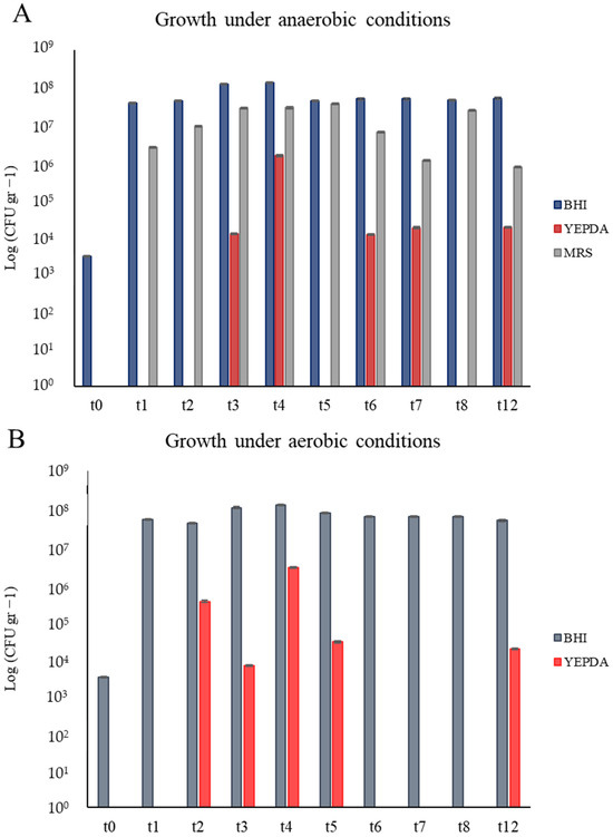 On the contrary, prokaryotes showed a stable dynamic both in anaerobiosis and aerobiosis, with values of concentration in the order of 107 CFU mL−1, and a peak between t3 and t4 of around 108 CFU mL−1. Similarly, microaerophilic bacteria on MRS fluctuated between 106 and 107 CFU mL−1, down to 105 CFU mL−1 at the end of the process (t12).