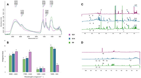 NMR and FTIR characterization of S14 (blue), S9 (green), and S21 (purple) hemp extract samples. FTIR spectra: (A) Average IR spectra with the major peaks as-signed; (B) mean integral areas calculated in the ranges between 3500 and 2800 cm−1, 1800 and 1700 cm−1, 1450 and 1300 cm−1, and 1200 and 900 cm−1. Data are presented as means ± SD (n = 3). Significant differences are represented with different letters, according to the ANOVA pairwise test (p ≤ 0.05). NMR spectra: (C) Hight field resonances for spectra of samples acquired in D2O using AU_WATERSC pulse program. Peak assignment is reported: 2 valine; 3 isoleucine; 4 leucine; 6 alanine; 7 GABA; 8 malic acid; 9 choline; 10 glycerol and its derivatives. (D) Low field resonances (10× tenfold-amplified) for spectra acquired in D2O using the AU_WATERSC pulse program. Peak assignment is reported: 12 sucrose; 15 trigonelline; 16 formic acid.