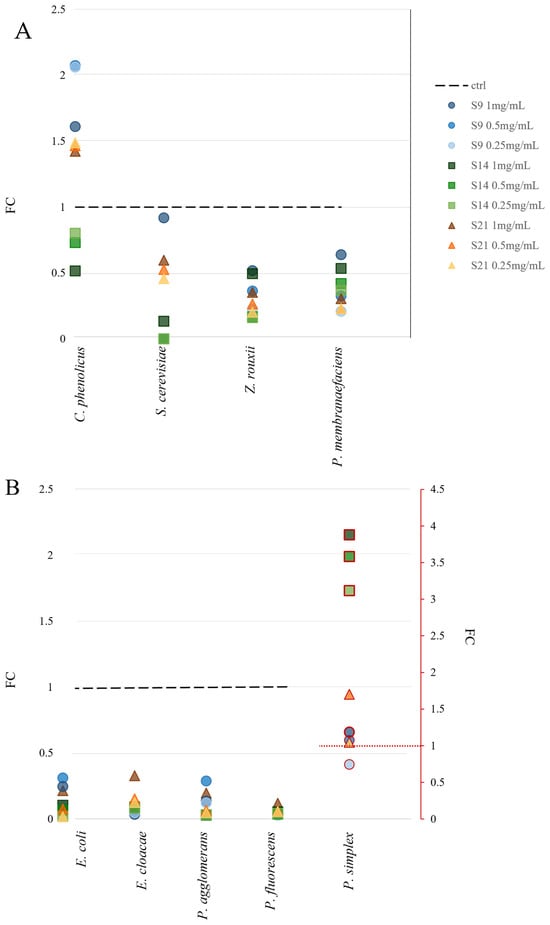 Comparison between single growth of strains in the presence of hemp extracts and in standard conditions, reported as growth percentage. Fold change (y-axis) correlates with the growth of the strain under standard conditions, represented by the dashed line. The shapes over this line represent conditions where growth in the extracts exceeded that in the standard medium. Shapes and colours refer to the extracts S9 (blue circle), S14 (green square), and S21 (brown triangle). The colour intensity refers to the concentration tested—the darker the shape, the higher the concentration. Growths were compared in pairs with the t-test analysis. All comparisons showed a statistical significance of p < 0.05. (A) Growth of fungal strains. (B) Growth of bacterial strains. For a correct visualization of the results, the growth of Peribacillus simplex (red outlined shape) is reported in the right secondary axis (red), due to the constant difference detected in growth values compared to the other strains.