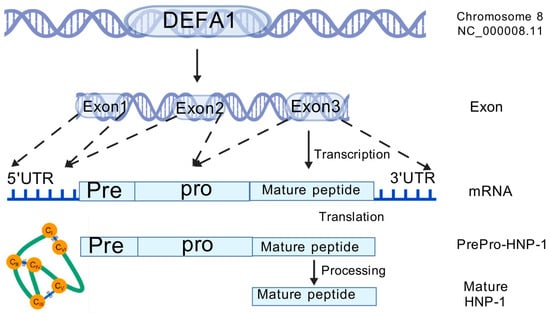 Bacterial resistance represents a significant threat to public health in the 21st century [1,2]. Approximately 1.27 million deaths are attributed to bacterial resistance against existing antibiotics in 2019, and predictions suggest that this number will rise to 10 million in 2050 if alternatives are not found [3], which has intensified the urgency for researchers to discover novel antimicrobial agents including vaccines, AMPs, bacteriophages, probiotics, antivirulence and antibiofilm molecules, essential oils and others [4]. Defensins, small cationic peptides generally ranging from 2–5 kDa [5], are increasingly recognized as promising candidates for new antibiotics, forming a vital part of the antimicrobial peptide (AMP) repertoire [6]. In mammals, defensins display a characteristic β-sheet structure that is stabilized by three disulfide bonds and can be classified into three types: α, β, and θ, which differ in their distribution and the connectivity of six cysteine residues [7,8]. Furthermore, mammalian defensins are crucial components of both innate and adaptive immunity [7] and have garnered considerable interest due to their antibacterial properties. Human alpha defensins are subdivided into myeloid and enteric α-defensins based on their expression profiles and genetic organization [9]. Among these, α-defensin-1, also known as human neutrophil peptide-1 (HNP-1), is predominantly produced by human neutrophils and exhibits extensive antimicrobial activity. Since their initial discovery in 1985, defensins, including HNP-1, have captivated researchers’ interest due to their structural characteristics, applications, and production challenges (Figure 1) [10]. However, HNP1-related researches have never been specifically reviewed before. This review aims to provide a concise overview of HNP-1’s gene, structure, immunological effects, antimicrobial effects, and biosynthesis.