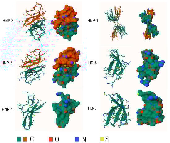 Furthermore, their sequences exhibit considerable similarity [11], and the only difference is an amino acid residue at the N-terminus: Ala for HNP-1, Asp for HNP-3, and absence for HNP-2, which explains the absence of its own gene [12,27]. HNPs are translated as 94 amino acids (MRTLAILAAILLVALQAQAEPLQARADEVAAAPEQIAADIPEVVVSLAWDESLAPKHPGSRKNMACYCRIPACIAGERRYGTCIYQGRLWAFCC) preproHNPs, which are co-translationally cleaved to 75 amino acids pro-peptides with a N-terminal prosegment having a negative charge that neutralizes the highly positively charged C terminal peptide. Further, 75 amino acids proHNPs are cleaved to a 56-amino acid intermediate form and onward to 29–30-amino acids mature HNPs [28] (Figure 2). Mature HNP-1, which comprises 30 amino acid residues, is enriched with cysteine (6; 20%), arginine (4; 13.3%), and alanine (4; 13.3%). The three-dimensional structure of HNP-1 was first elucidated by nuclear magnetic resonance spectroscopy (NMR) in 1992 [13,29]. Subsequently, the crystal structures of chemically synthesized HNP-1 and recombinant HNP-1 in a membrane-bound state were determined using solid-state NMR spectroscopy [14,30]. In the crystal structure, two HNP-1 monomers form a dimer through two pairs of intermolecular H-bonds (residues 18 and 20) between the two β2 strands, extending the triple-stranded β-sheet to a six-stranded β-sheet [31]. Structurally, six alpha defensins mutually exhibit three highly conserved disulfide bonds formed by six cysteines: C1:C6, C2:C4, C3:C5, which stabilize their three-stranded beta-sheet structure for dimerization, oligomerization, and multimerization, as well as protect them from degradation by processing enzymes [32,33] (Figure 3). In addition to disulfide bonds, they also share conserved Arg5, Glu13, and Gly17 (HNP1/HNP3 numbering). A salt bridge formed by Arg5 and Glu13 is important for stabilizing defensins from degradation by enzymes in vivo, but is irrespective of the folding and bactericidal activities of defensins [34]. Gly17 was discovered to assist in the formation of a classical beta bulge [35,36], and it also involves HNP-1’s dimerization and self-association, elucidating its conservation in all mammalian alpha-defensins [37]. Early in 1986, Daher et al. found that the inactivation ability of HNP-1 against herpes simplex virus 1 (HSV-1) is abrogated by the destruction of disulfide bonds through reduction and alkylation [38]. In the case of HNP-1, its disulfide bonds play a crucial role in almost all of its antimicrobial functions, including the direct inactivation of viruses and toxins, and binding to lipid II and pathogen proteins [39,40,41]. Notably, while linear HNP-1 is inactive, its cyclic analogs with different disulfide bond pairings do exhibit antimicrobial activity [42]. Moazzezy and coauthors revealed the truncated HNP-1 analogs’ elimination ability against multidrug-resistant E. coli and their anti-inflammatory activity in vivo [43,44]. Subsequently, they further designed modified peptides from HNP-1, which exhibited higher affinity for lipid II in silico, suggesting their potential antimicrobial activity [45].