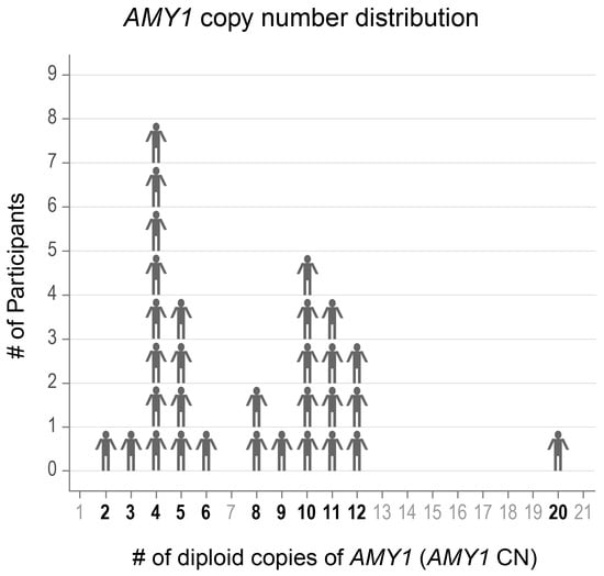 We used the QIAamp 96 DNA Blood Kit, QIAamp Blood Mini Kit, and the QIAamp Investigator Kit (Qiagen, Germantown, MD, USA, cat # 51161, 51104, 56504) to extract genomic DNA from saliva samples. We performed quantitative PCR (qPCR) to amplify AMY1 and EIF2B2 (our reference gene, with CN = 2) with primers, as described in Poole et al. [32]. For each gene, each 10 μL qPCR reaction consisted of 1 μL genomic DNA at 5 ng, 0.5 μL of each forward and reverse primer at 10 μM, 3 μL of PCR grade H2O, and 5 μL iTaq™ Universal SYBR® Green Supermix (Bio-Rad Laboratories, Hercules, CA, USA, cat # 1725122). Using a Roche LightCycler® 480 Real-Time PCR Instrument, the qPCR conditions were as follows: initial denaturation at 95 °C for 5 min, 40 cycles at 95 °C for 10 s, and 60 °C for 30 s. On each reaction plate, we developed a standard curve using genomic DNA NA12286 (Coriell Institute; AMY1 CN = 2), including negative controls containing PCR grade water only, and including the following genomic DNA with previously estimated AMY1 CNs as positive controls: NA18972, NA12873, NA10472, NA12890, NA10852, NA12043, NA11992, NA12414, NA12340, NA06994, NA12342, NA12286, NA18522, and NA19138 (Coriell Institute for Medical Research, Camden, NJ, USA). All reactions were performed in quadruplicate and results were averaged for technical replicates with a coefficient of variation of less than 0.05. At least two qPCR runs were performed for all saliva samples and the median value of all qPCR results was used as the final qPCR AMY1 CN value. For digital droplet PCR (ddPCR), genomic DNA was digested with HaeIII (New England Biolabs, Ipswich, MA, USA, cat # R0108S). The DNA was diluted to 15 ng/µL before ddPCR was performed in duplicate reactions using Life Technologies TaqMan™ Copy Number Assay Id Hs07226361_cn for AMY1 (Thermo Fisher Scientific, Waltham, MA, USA) and TaqMan Copy Number Reference Assay Hs06006763_cn for AP3B1 to normalize for total DNA on a QX100 Droplet Digital PCR System (Bio-Rad Laboratories, Hercules, CA, USA). We averaged the median of all qPCR results and the two ddPCR results to determine the final AMY1 CN used in our analyses. For two of the donors, we did not obtain qPCR results, and thus only the two ddPCR results were averaged for use in the analyses.