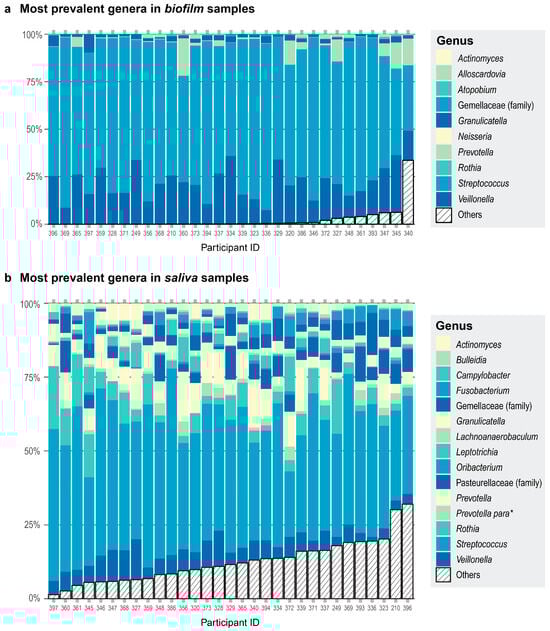 Each participant is represented by a column. Participant ID is on the x-axis. The color assignments differ between panels, and some are used more than once within each panel. (a) Proportions of the top 10 most prevalent genera in the biofilm samples are shown in different colors and any other genera present are collapsed in the category Others (striped bar). The top three genera were present in the same number of samples. (b) Proportions of the top 15 most prevalent genera in the saliva samples are shown in different colors and any other genera present are collapsed in the category Others (striped bar). All 15 genera were present in all the donors. * Prevotella para is an abbreviation for the genus Prevotella currently assigned to the family Paraprevotellaceae in the Greengenes database.