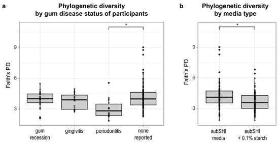 The alpha diversity of biofilms is associated with self-reported gum disease status and starch (* p < 0.001). (a) Faith’s phylogenetic diversity (PD) is significantly lower in biofilms cultured from donors with periodontitis compared to biofilms cultured from donors with no reported gum disease. (b) Faith’s PD is significantly lower in biofilms cultured in starch-added media.