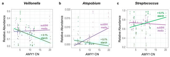 The relative abundances of Veillonella and Atopobium are influenced by an interaction between AMY1 CN and media. For high AMY1 CN, the relative abundances of (a) Veillonella (p = 0.038) and (b) Atopobium (p = 0.001) are lower in starch-supplemented media. (c) There is a trend for the opposite relationship in Streptococcus; for high AMY1 CN, the relative abundance of Streptococcus (p = 0.078) is higher in starch-supplemented media.