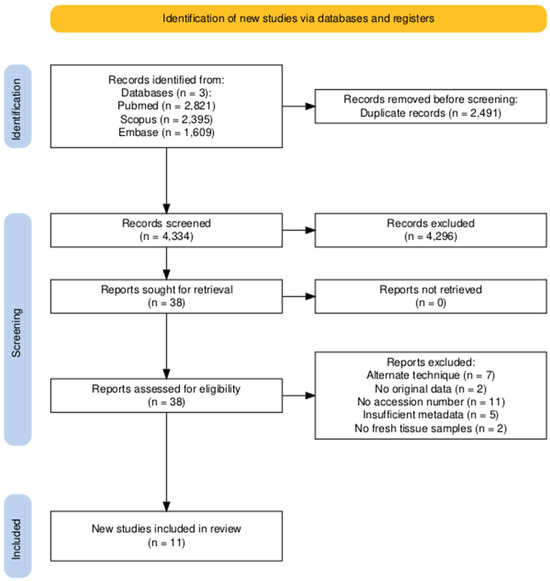 A comprehensive search of PubMed, Scopus, and Embase databases identified 6825 records published up to 31 December 2023 (Figure 1). After removing duplicates, 4334 records remained for screening. Title and abstract screening excluded 4296 records based on irrelevance, including studies unrelated to the microbiome, non-human microbiome studies and microbiome studies of non-breast tissue samples including breast milk, nipple aspirate fluid, feces, gut, saliva, oral, nasal, nasopharyngeal, respiratory, vaginal, urine, and blood. This left 38 full-text articles for eligibility assessment.