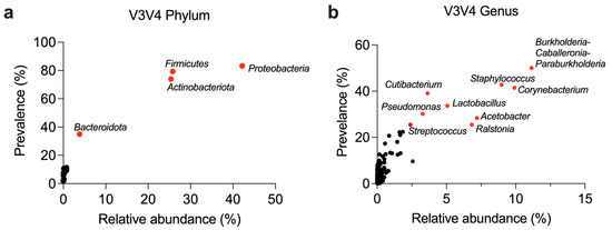 General composition of the breast microbiome in 16S rRNA V3V4-sequenced samples. The prevalence and mean relative abundance of taxa are shown at the (a) phylum and (b) genus levels for the V3V4 primer set (unrarefied, n = 832). The top phyla and genera are labelled and highlighted with red symbols to indicate prominence in the dataset.