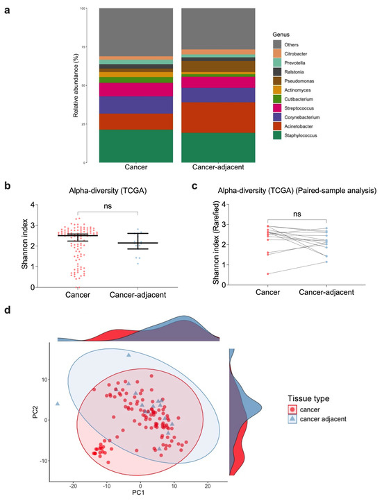 TCGA-BRCA microbial abundance and diversity. (a) The mean relative abundance of genera in cancer and cancer-adjacent breast tissue. (b) Shannon index for unpaired samples. (c) Shannon index for paired cancer and cancer-adjacent samples. (d) PCoA density plot based on the Euclidean distances of CLR-transformed abundance data representing beta diversity. The Kruskal-Wallis test with Dunn’s multiple comparison was performed for unpaired analysis (a), and the Wilcoxon paired signed-rank test was performed for paired sample analyses (b). Not significant (ns), p > 0.05.