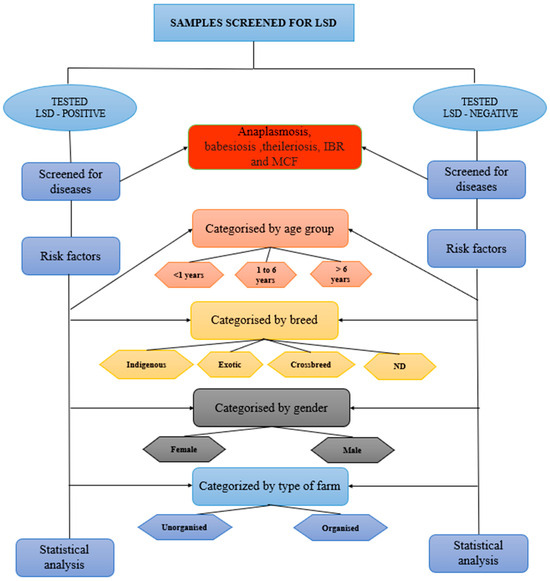 A total of 414 blood samples were collected from eight states in India for analysis. A cross-sectional study was conducted to examine the presence of other infectious agents alongside LSDV in the sampled animals. This study employed a questionnaire to retrieve the basic information of the sampled animals including age, sex, breed, and farm type, as well as demographic information, such as state, region, and district. The samples were categorised based on different criteria (Figure 1).