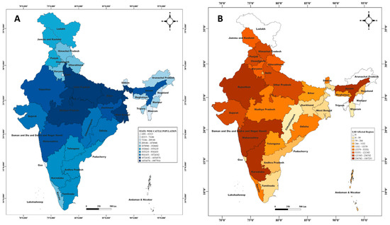 According to the Basic Animal Husbandry Statistics (BAHS) and the 20th Livestock Census, the central and northern regions of India, including Madhya Pradesh, Rajasthan, and Bihar, exhibit a high cattle population. In contrast, the southern and western regions, such as Maharashtra, Gujarat, Andhra Pradesh, and Karnataka, have a moderate cattle population (Figure 2A).