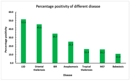 Distribution of different diseases in cattle. The bar diagram representing the percentage positivity of LSD, IBR, MCF, babesiosis, anaplasmosis, oriental theileriosis, and tropical theileriosis on the X-axis and the percentage positivity on the Y-axis.