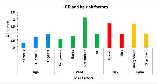 LSD risk factors. The bar diagram showing the association of risk factors (age, breed, sex, and type of farm) with occurrence of lumpy skin disease using univariate regression analysis.