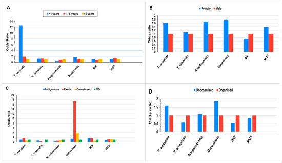 Babesiosis exhibited a significant association in both the univariate and multivariate analyses. Among the different breeds, exotic cattle demonstrated a 17- to 22-fold increased risk for babesiosis compared to other breeds within the group. Additionally, in both analyses, female calves under one year of age from unorganised farms showed a higher susceptibility to the disease compared to their counterparts with the same parameters.