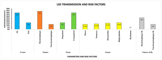 Flies, particularly Stomoxys, Haematobia, and Musca, reproduce in moist, decomposing organic matter, including rotting hay and manure. Poor hygiene conditions in unorganised farms, such as accumulated manure and prolonged storage of feed, contribute to increased disease transmission, as observed in our findings. Our study identified a strong correlation between LSD and coexisting haemoprotozoan diseases and viral infections, supported by a chi-square value of 133.1 (p < 0.0001). Transmission studies also highlighted the role of vectors, particularly biting flies like Stomoxys and Haematobia, as significant mechanical vectors for Theileria orientalis (theileriosis) and LSDV [14,34]. Musca domestica was also implicated in LSDV transmission, likely due to its interaction with open wounds or scabs created during treatment, which provide a source for blood meals [35]. Hard ticks, such as Rhipicephalus spp., were found to transmit LSDV and different haemoprotozoan diseases. However, biting flies demonstrated a greater capacity for disease transmission compared to ticks. This association underscores the potential role of vector-borne haemoprotozoan diseases as significant risk factors for LSD. A previous report by Chihota et al. (2001) [8] underscores the role of ticks in spreading diseases like theileriosis and anaplasmosis, which are prevalent in LSD outbreak regions. The presence of multiple infections in LSD-positive animals highlights the need for integrated disease management strategies, including comprehensive vector control measures. While the detection of multiple pathogens in vectors and cattle does not confirm simultaneous transmission of pathogens by the same vector, the possibility of co-transmission remains, highlighting the complex role of vectors in disease dynamics.