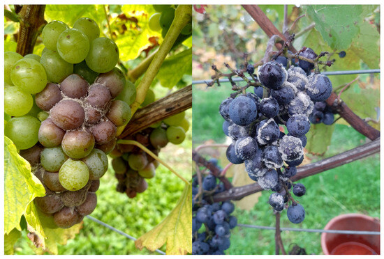 - Altieri, V.; Rossi, V.; Fedele, G. Biocontrol of Botrytis cinerea as Influenced by Grapevine Growth Stages and Environmental Conditions. Plants 2023, 12, 3430. [Google Scholar] [CrossRef]