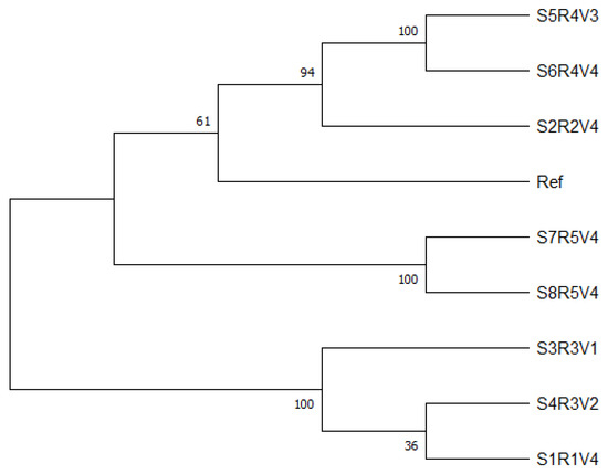 A UPGMA tree was constructed based on the resulting fragment sizes (see Figure 4) showed distinct relationships for all the tested strains. There were two main groups, S1R1V4 and Ref, as well as the other strains. The other strains further subdivided into smaller groups.