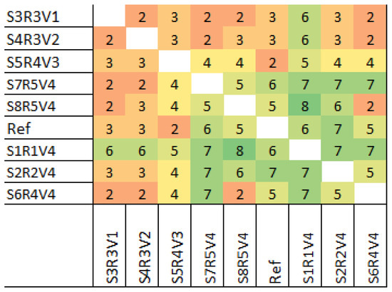Results of the SSR-PCR analysis. The total differences of all primer pairs used in the SSR-PCR were used to generate a heatmap, as previously published [48], to show their differences throughout the strains. A minimum of zero (red) to nine (green) was possible.