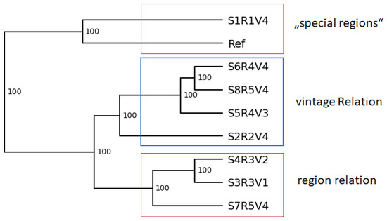 UPGMA Tree of the selected Botrytis cinerea strains based on the results of the SSR-PCR. Bootstrap of 1000 was calculated and is indicated on the branches in %. Potential group relations are highlighted (purple: untypical vintage regions–reference strain and strain from a non-viticulture-related urban region; blue: close relation in vintage; red: close regional relation; Palatinate region).
