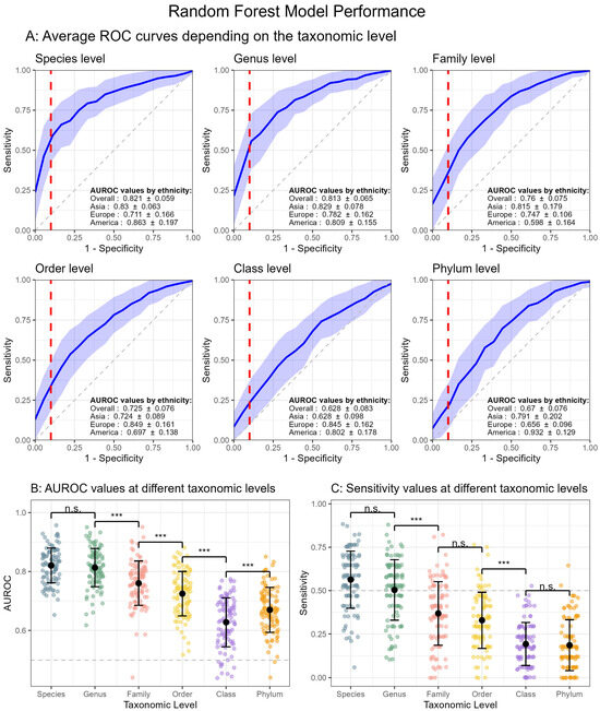 Random Forest model performance. Performance was evaluated across 100 runs using a RF model for different taxonomic levels—species, genus, family, order, class and phylum. (A) Average Receiver Operating Characteristic (ROC) curves for COVID-19 prediction. The blue line represents the mean ROC curve, and the shaded region indicates the standard deviation. The x-axis represents specificity, while the y-axis represents sensitivity. The red dashed line marks a specificity of 90%. Area Under the ROC Curve (AUROC) values are reported as mean ± standard deviation for the overall dataset and stratified by ethnicity (Asia, Europe and America). (B) AUROC values. (C) Sensitivity values measured at a specificity of 90%. Data are plotted as mean ± standard deviation, with taxonomic levels on the x-axis. The gray dashed line represents an AUROC or sensitivity of 0.5, which is equivalent to random classification [8]. Asterisks indicate significant differences between consecutive taxonomic levels (Tukey’s post hoc test), where *** p-value < 0.001 and n.s. = not significant.