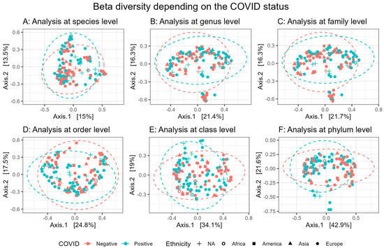 Beta diversity measured between COVID-19-positive (blue) and -negative (red) patients. Principal Coordinate Analysis (PCoA) plots show beta diversity (Bray–Curtis distance) computed at the species (A), genus (B), family (C), order (D), class (E) and phylum (F) taxonomic levels, with ellipses indicating 95% confidence intervals for each group. Samples were grouped according to their corresponding ethnicity, with those of unknown or missing ethnicity (NA) represented by a plus sign (+).