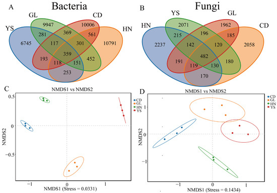 Beta diversity is a comparative analysis of the microbial community composition of different samples. Through nonmetric multidimensional scaling (NMDS) analysis, the classification of multiple samples can be achieved, further demonstrating differences in species diversity among samples. The more similar the compositions of microbial communities in the samples, the closer they are on the coordinate map. With regard to endophytic bacteria, the samples from HN, GL, YS, and CD were separated in the direction of NMSD1 and NMDS2 (Figure 1C). With regard to endophytic fungi, the samples from HN and CD were separated in the direction of NMDS1, while those from GL and HN were separated in the direction of NMSD2 (Figure 1D). The samples from CD were relatively close to the samples from YS in the direction of NMDS2 (Figure 1D).