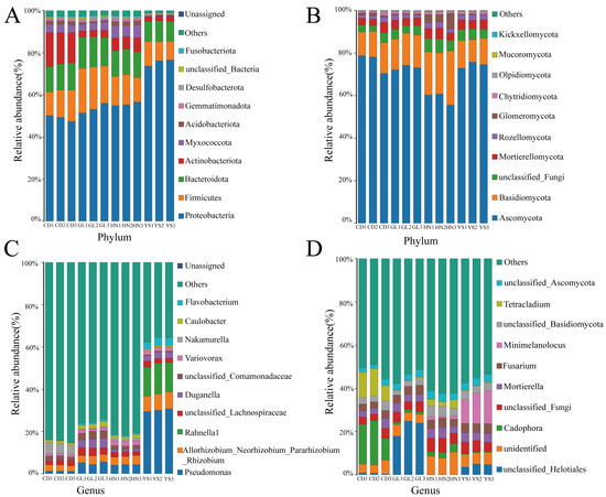 The community and relative abundance of endophytes in P. rotata roots from HN, GL, YS, and CD habitats. (A) Endophytic bacteria at the phylum level. (B) Endophytic fungi at the phylum level. (C) Endophytic bacteria at the genus level. (D) Endophytic fungi at the genus level. The color legend followed the same order as the colors in the bars, from bottom to top.