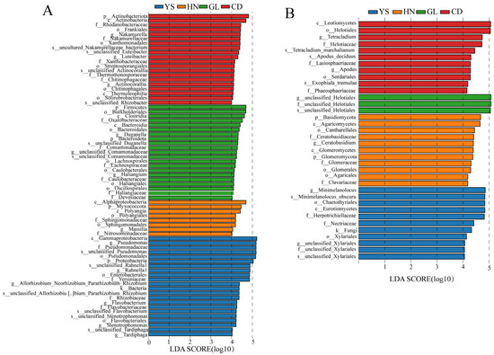 LDA analysis of endophytic communities in P. rotata roots from four habitats. (A) LDA analysis of endophytic bacteria at the genera level. (B) LDA analysis of endophytic fungi at genera level. The first letter before each bacterial and fungal name represents: p_ represents phylum, o_ represents order, f_ represents family, g_ represents genus, s_ represents species.