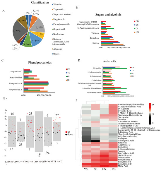 Through metabolomic analysis, we identified a total of 600 metabolites and selected the top 30 DAMs with the highest content levels for further examination (FC > 1, p < 0.05, and VIP > 1). This selection included 5 sugars and alcohols, 4 phenylpropanoids, 7 amino acids, 3 organic acids, 3 alkaloids, 2 terpenoids, 2 polyphenols, 1 nucleotide, 1 ketone, aldehydes, acids, 1 vitamin, and 1 other (Table S5, Figure 4A). Among them, the vast majority of amino acid compounds were at high levels in regions GL and CD (Figure 4D). In phenylpropane compounds, the level of forsythoside B was high (Figure 4B). Comparing the differential metabolites among four regional groups, the volcano plot showed that the distribution range of differential metabolites between HN and GL was relatively large, while the distribution range of differential metabolites between GL and YS was relatively small (Figure 4E). The volcano plot (Figure 4E) revealed that HN and CD exhibited 15 downregulated and 15 upregulated metabolites, while GL and YS demonstrated 23 downregulated and 7 upregulated metabolites. Additionally, GL and CD displayed 7 downregulated and 23 upregulated metabolites, and HN and GL showed 19 downregulated and 11 upregulated metabolites. HN and YS exhibited 24 downregulated and 6 upregulated metabolites, whereas YS and CD demonstrated 3 downregulated and 27 upregulated metabolites (Figure 4E). A cluster heat map analysis was conducted to visualize the changes in the content of the top 30 metabolites (Figure 4F, Table S5). The results indicated that the distribution of high-content compounds was specific to the four habitats. Notably, the expression levels of metabolites Forsythoside B and Malic Acid were relatively high in all four regions (Figure 4F). Five compounds with elevated levels were identified in HN, including D-(+)-malic acid, (S)-malic acid, verbascoside, forsythiaside A, and forsythoside I (Figure 4F), while two compounds with elevated levels were identified in GL (Figure 4F). The expression levels of six metabolites were low in all four regions and reached their lowest in YS, including 3-(Carboxymethylamino) propanoic acid, kaempferol-3-O-Β-D-glucosyl (1-2) rhamnoside, L-glutamic acid, shanzhiside methyl ester, 4-hydroxyisoleucine, haplopine, and chlorogenic ccid (Figure 4F). Furthermore, eight compounds were found to have high levels in CD, including L-ornithine (hydrochloride), N-acetylneuraminic acid, dl-Arginine, cyclo (Ile-Leu), 4-methyl-5-thiazoleethanol, stachydrine, isomaltose, and sucrose (Figure 4F).
