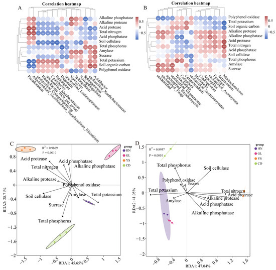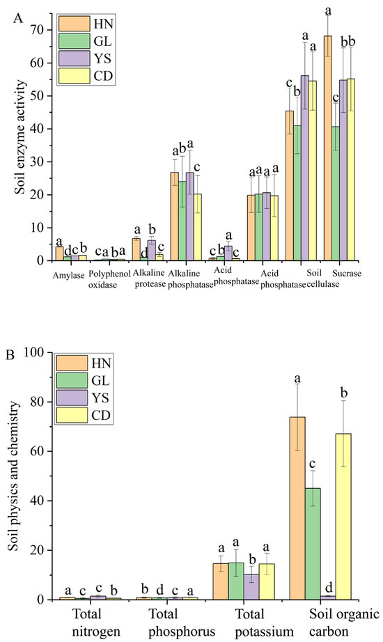Twelve physicochemical indicators, including amylase, polyphenol oxidase, alkaline protease, alkaline phosphatase, acid protease, acid phosphatase, soil cellulase, sucrase, total nitrogen, total phosphorus, total potassium, and soil organic carbon, were measured and analyzed in the rhizosphere soil of P. rotata across different habitats. Among them, soil cellulase and sucrase showed high activity levels in four different habitats, with 41.00 − 6.13 (U/g) and 40.63 − 68.16 (U/g), respectively (Figure 5A). The alkaline phosphatase and acid phosphatase indicated higher activity levels with 20.20 − 26.78 (U/g) and 19.71 − 20.63 (U/g), respectively (Figure 5A). But there is no significant difference in the activity level of acid phosphatase among the four regions (Figure 5A). The activity levels of polyphenol oxidase, acid protease, amylase, and alkaline protease were low in all four regions, with 0.24 − 0.47 (U/g), 0.67 − 4.44 (U/g), 1.17 − 4.24 (U/g), and 1.03 − 6.71 (U/g) (Figure 5A). Four physical and chemical indicators in the soil showed that soil organic carbon had high content in the HN, GL, and CD regions with 45.03 − 78.83 (g/Kg) and the lowest content level in the YS region with 1.47 (g/Kg) (Figure 5B). Total potassium had a high content level in the HN, GL, and CD region with 14.44 − 14.87 (g/Kg), and there is no significant difference in the HN, GL, and CD region (Figure 5B). Total potassium showed a low content level in the YS region with 10.23 (g/Kg). The content levels of total nitrogen and total phosphorylation are relatively low in four habitats, with 0.60 − 1.47 (g/Kg), 0.80 − 1.93 (g/Kg) (Figure 5B).