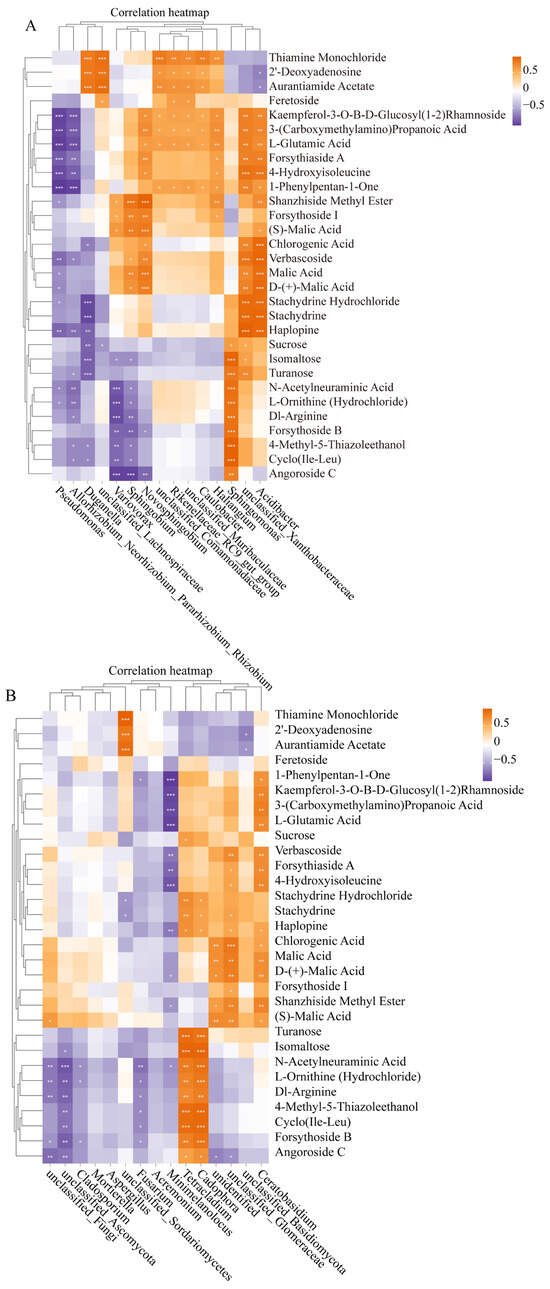 Correlation analysis between top 15 endophytic bacteria or fungus and top 30 metabolites in P. rotata roots from four habitats. (A) Correlation analysis between 15 bacteria and top 30 metabolites. (B) Correlation analysis between 15 fungus and top 30 metabolites. Orange text represented positive relationship, purple text represented negative relationship. * p < 0.05, ** p < 0.01, *** p < 0.001.