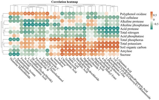 Conversely, the activity of acid protease exhibited negative correlations with 13 compounds (L-glutamic acid, 3-(carboxymethylamino) propanoic acid, kaempferol-3-O-Β-D-glucosyl(1-2) rhamnoside, 1-phenylpentan-1-one, 4-hydroxyisoleucine, forsythiaside A, shanzhiside methyl ester, haplopine, stachydrine hydrochloride, stachydrine, D-(+)-malic acid, malic acid, verbascoside), and alkaline phosphatase demonstrated negative correlations with 9 compounds (turanose, isomaltose, angoroside C, cyclo(Ile-Leu), 4-methyl-5-thiazoleethanol, forsythoside B, Dl-arginine, L-ornithine (hydrochloride), N-acetylneuraminic acid). The activity of amylase exhibited 13 positive correlations with 11 compounds (chlorogenic acid, verbascoside, malic acid, D-(+)-malic acid) and negative correlations with 2 compounds (angoroside C, 2′-deoxyadenosine). Notably, the expression of soil organic carbon and total potassium were positively correlated with 6 compounds (L-glutamic acid, 3-(carboxymethylamino) propanoic acid, kaempferol-3-O-Β-D-glucosyl (1-2) rhamnoside, 1-phenylpentan-1-one, 4-hydroxyisoleucine, forsythiaside A), while the activity of acid protease were negatively correlated with them (Figure 7).