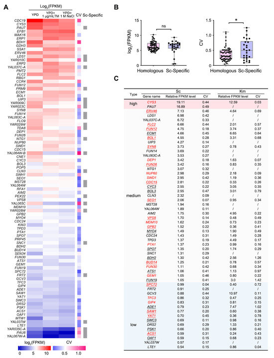 RNA-seq data were extracted from a previous study [27]. Cells were grown in SC-Ura + GH medium overnight, then diluted into 50 mL fresh YPD medium to an initial OD600 of 0.2. When the OD600 reached 0.6, the cells were collected and washed with ddH₂O. To induce stress, the medium was supplemented with tunicamycin at a final concentration of 1 μg/mL or NaCl at a final concentration of 1 M. The cells were treated for 1 h, collected, washed with ddH2O, and then subjected to RNA extraction and RNA-seq [27]. To identify gene loci exhibiting stable transcriptional activities, the coefficients of variation (CV) were calculated by dividing the standard deviation by the mean. Sc-specific genes were identified previously [27]. The relative FPKM level refers to the ratio of the average FPKM value of an R1 gene across three conditions to the average FPKM value of three housekeeping genes (SWC4, TRK1, MPE1) across the same conditions.