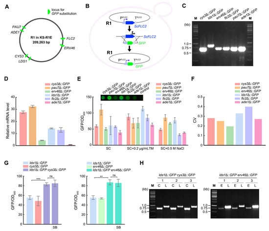 To verify whether loci on R1 can serve as insertion sites for heterologous genes, we inserted GFP into six loci with varying transcriptional activities: CYS3 and PAU7 (strong), ERV46, FLC2, and LDS1 (medium), and ADE1 (weak) (Figure 3A). We constructed a GFP donor containing the GFP ORF flanked by 500 bp of upstream and downstream sequences of the target R1 gene ORF. KS-R1E was transformed with a plasmid co-expressing gRNA and Cas9 along with the GFP donor. Through recombination between the donor and the R1 loci, the GFP ORF replaced the target gene ORF in situ. Subsequently, GFP expression was driven by the native promoter and terminator of the targeted R1 gene (Figure 3B).