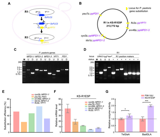 Substitution of R1 genes by P. pastoris disulfide bond formation genes improved the expression of heterologous proteins. (A) Schematic view of replacing an R1 gene in situ with P. pastoris disulfide bond formation genes. (B) Map of R1 after substitution of five R1 genes with P. pastoris genes. (C) Identification of the substitution of R1 genes by P. pastoris genes via PCR. The positions of primers relative to the loci and the expected sizes of the PCR products are shown in Figure S1C. U, upstream primer pair; D, downstream primer pair. (D) Validation of position markers and deletion of selective markers on R1 in KS-R1E5P. (E) Efficiency of substitution at the different loci. Efficiency was calculated as the percentage of positive clones among 24 total clones. (F) Relative mRNA levels of the P. pastoris genes in KS-R1E5P. Cells were collected after growing in YPD medium for 12 h. mRNA levels of the P. pastoris genes were normalized to that of KmSWC4. Values represent the mean ± SD (n = 3). (G) Comparison of the activities of BadGLA and TeGlaA expressed by KS-R1E5P and FIM-1ΔU. Cells were grown in YD medium for 72 h, and activities in the supernatant were measured. The average activity in FIM-1ΔU was designated as 1. Values represent the mean ± SD (n = 3). *: p < 0.05, ***: p < 0.001.