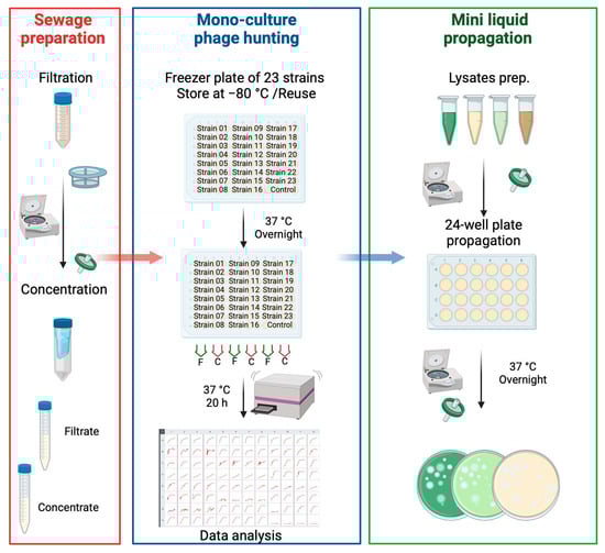 Lysates with potential phages were centrifuged, filter-sterilized, and subjected to a mini-liquid propagation step to amplify any potential phages. Briefly, 100 µL of potential phage lysate was pre-incubated with 100 µL of the host sub-culture for 10 min at room temperature (RT) in a 24-well tissue culture plate. Then, for each potential phage/host co-culture, 2 mL LLB-S was added and incubated overnight. On the following day, the co-cultures were centrifuged, filter-sterilized using a 0.22 µm PES membrane filter, and tested for the presence of phages against the corresponding host by the double agar layer overlay assay (Figure 1).