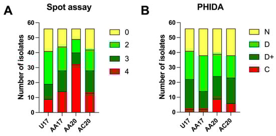 Bar plots showing the spot assay versus PHIDA results. (A) Spot assay results. The numbers represent the lysis pattern in the spot: 4 = complete clearing, 3 = clearing with hazy background, 2 = substantial turbidity through the cleared zone, 1 = few individual plaques, and 0 = no clearing. (B) Phage–host interaction results expressed as C = complete inhibition of the bacterial growth, D+ = more than 5 h delay in bacterial growth compared to control, D = time difference to reach detection threshold between sample and control is ≥1 and <5 h, and N = small effect on bacterial growth endpoint.