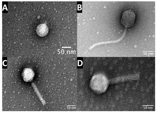 The four tested phages were purified for TEM imaging using CsCl density gradient centrifugation. For every phage, phage lysate—at least 1010 PFU/mL—was precipitated using the zinc chloride method, as previously described [28]. The precipitate was resuspended in 16 mL of SM buffer, solid CsCl was added at a rate of 0.75 g/mL of phage suspension, and the rest of the protocol was performed according to the manufacturer recommendations (Beckman Coulter, Brea, CA, USA, LE-80 Ultracentrifuge). The CsCl gradient was centrifuged at 40,000 rpm in a 70.1 Ti rotor at 4 °C for 20 h. For each phage, the ghost band was removed and washed with SM buffer [29].