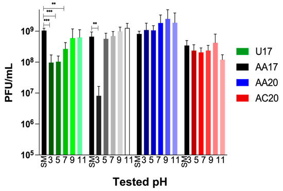 pH stability of the four tested phages. Following an hour of exposure to varying pH levels, phage titers were determined. The pH stability of phages was compared to SM control (pH 7.4). SM control is represented in black, and shades of each color represent pH from low to high. Error bars show the standard deviation of a biological duplicate and technical triplicate experiment. Statistical analysis was performed on each phage set by GraphPad Prism (v9) (GraphPad Software Inc., San Diego, CA, USA) using a one-way ANOVA test, followed by Dunnett’s multiple comparisons test. Statistical significance is represented as ** p ≤ 0.01 and *** p ≤ 0.001.