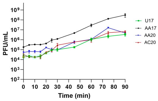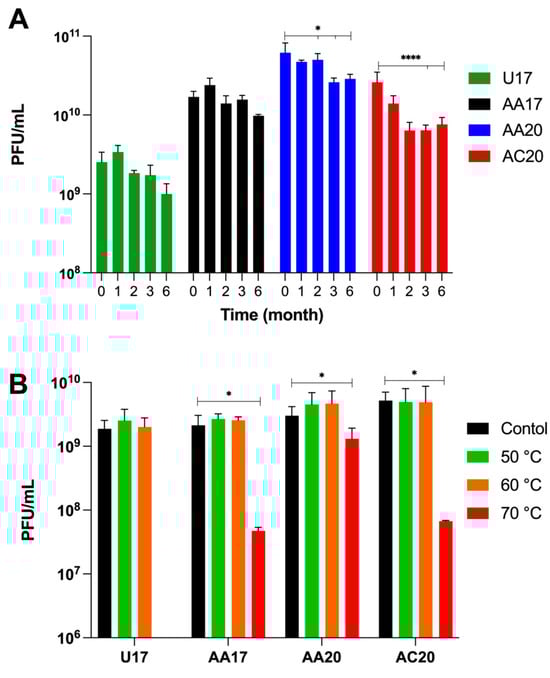We also examined each phage’s stability for one hour at five stressing temperatures from 50 °C to 90 °C (Figure 5B). All phages were stable at 50 °C and 60 °C; however, phage U17 was completely inactivated at temperatures 70 °C and above, while phages AA17 and AC20 had a 1.7 log reduction in titer. Phage AA20 was more stable, with less than half a log reduction at 70 °C (Figure 5B). All phages lost activity following exposure to 80 °C and 90 °C; thus, they are not shown in the figures.