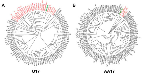 A rooted tree of the large terminase proteins of (A) U17 and (B) AA17. Each tree was generated using the large terminase protein from each phage against the top 100 BLASTp hits from the NCBI database. A Clustal Omega (v 1.2.3) protein alignment was performed, and the resulting alignment was run with RAxML (v8.2.11) to generate a phylogenetic tree. Green represents large terminase protein of U17 and AA17 and red represents large terminase protein hits with percentage similarity between 95 and 100% to U17 and AA17. The figure was generated using Geneious Prime.