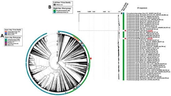 Proteomic tree of phages AA20 and AC20. (A) Circular proteomic tree based on genome-wide similarities of phages AA20 and AC20 (marked with red stars) and closely related reference phage genomes. (B) Rectangular proteomic tree of phage phages AA20 and AC20 (marked with red stars and labeled in red) and 43 phages with the highest ViPTree SG scores.
