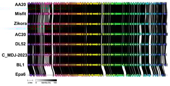 Phages AA20 and AC20 have a genome of 65,726 bp and 66,242 bp, respectively, and a GC% of 54.8 and 55, respectively (Figure 6C). The AA20 phage encodes 92 putative proteins, of which 60 are hypothetical, 30 are involved in the virion morphogenesis and transcription and translation processes, and two are involved in lysis. Phage AC20 encodes 97 proteins, of which 64 are hypothetical, 29 are involved in the virion morphogenesis and transcription and translation processes, and two are involved in lysis. Due to genomic similarities observed while annotating the genomes, we aligned the AA20 and AC20 genomes by LASTZ, which revealed a 95.6% pairwise identity (Figure 6D).